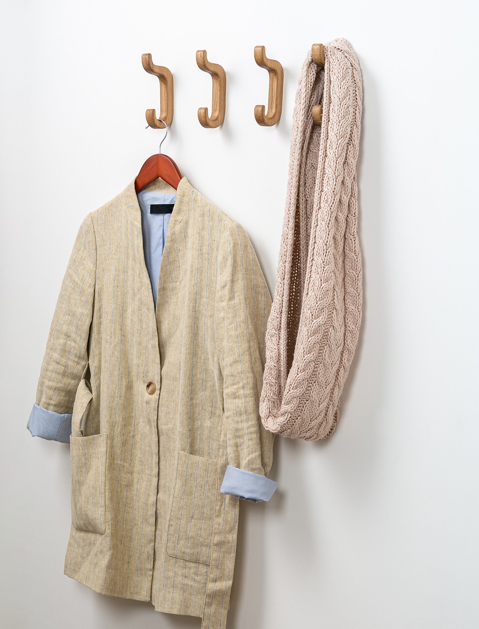 The wooden wall hook is made of solid European oak.It is carefully sanded and coated with furniture oil, which accentuates the texture of the wood and protects it from external factors.