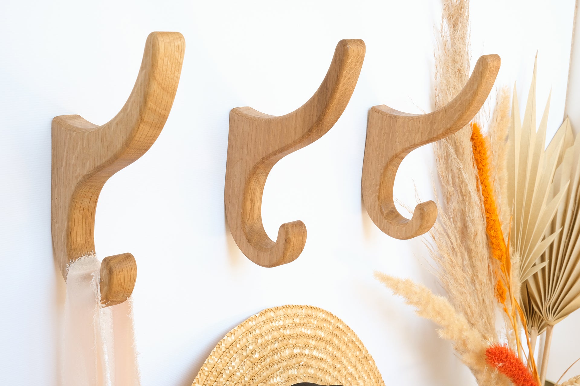The wooden wall hook is made of solid European oak.It is carefully sanded and coated with furniture oil, which accentuates the texture of the wood and protects it from external factors.