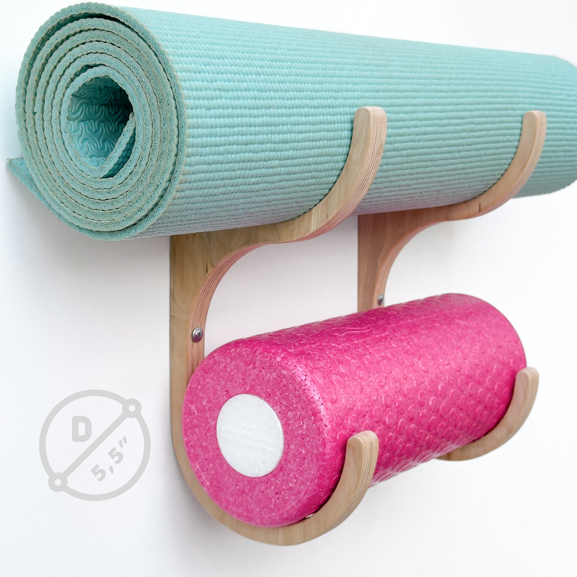 Hooks for yoga mats and foam rollers for organizing your home gym or yoga corner.