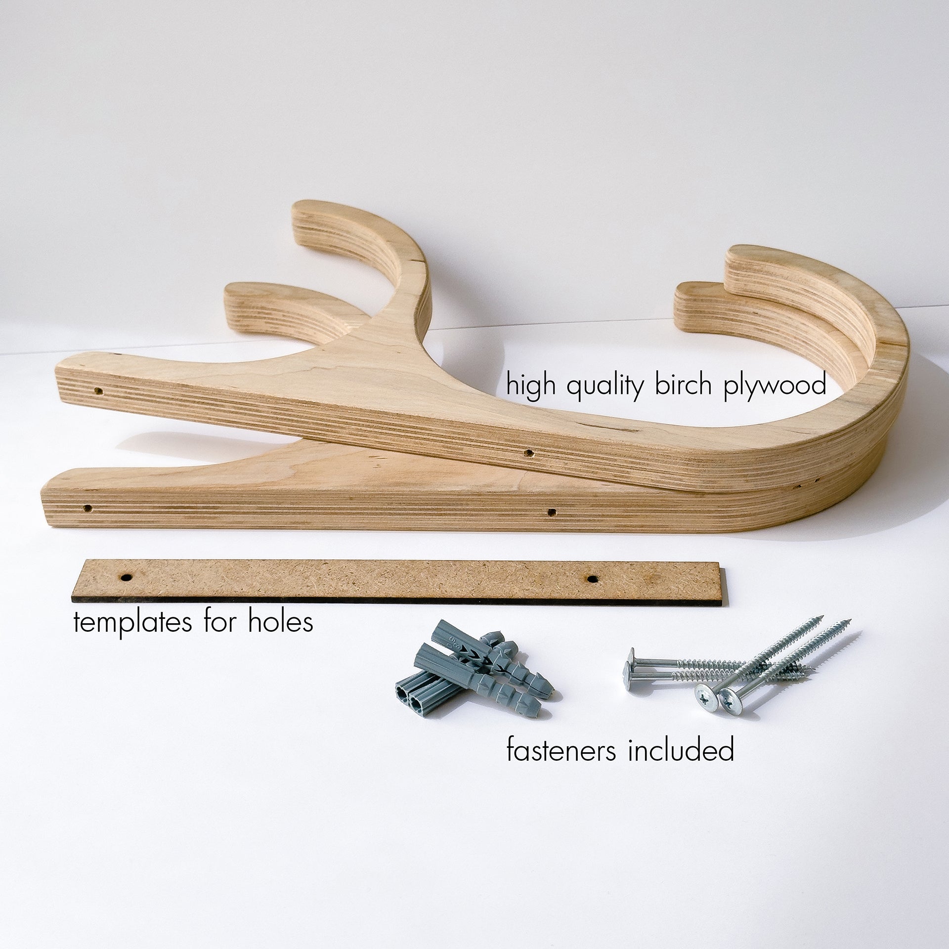 Contents: 2 lath with hooks made of plywood, template for holes, screws and plastic dowels.