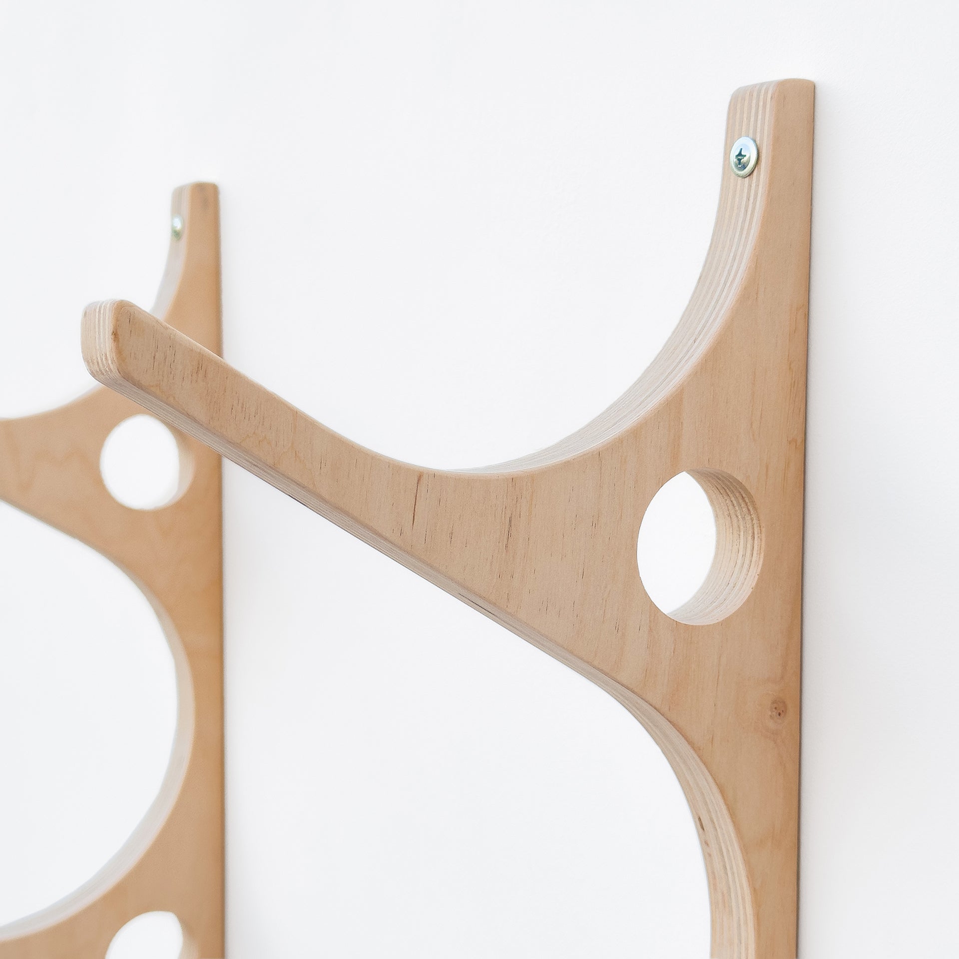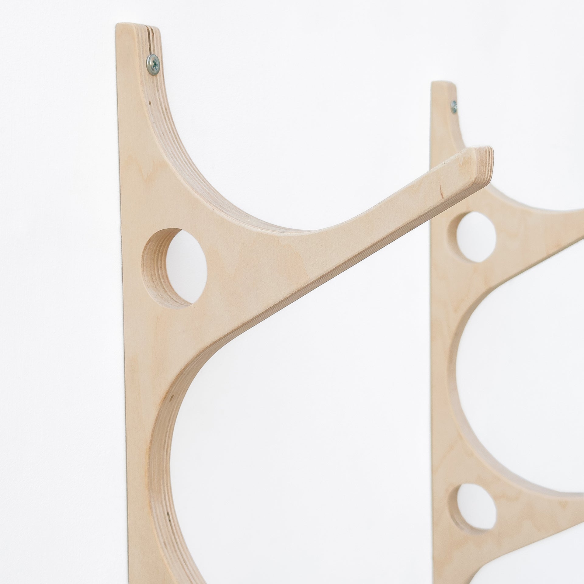 Contents: 2 lath with hooks made of plywood, template for holes, screws and plastic dowels.